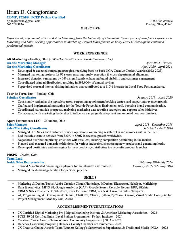Experienced professional with a B.B.A. in Marketing from the University of Cincinnati. Eleven years of workforce experience in Marketing and Sales. Bridging creative strategy with technical automation to drive business impact.